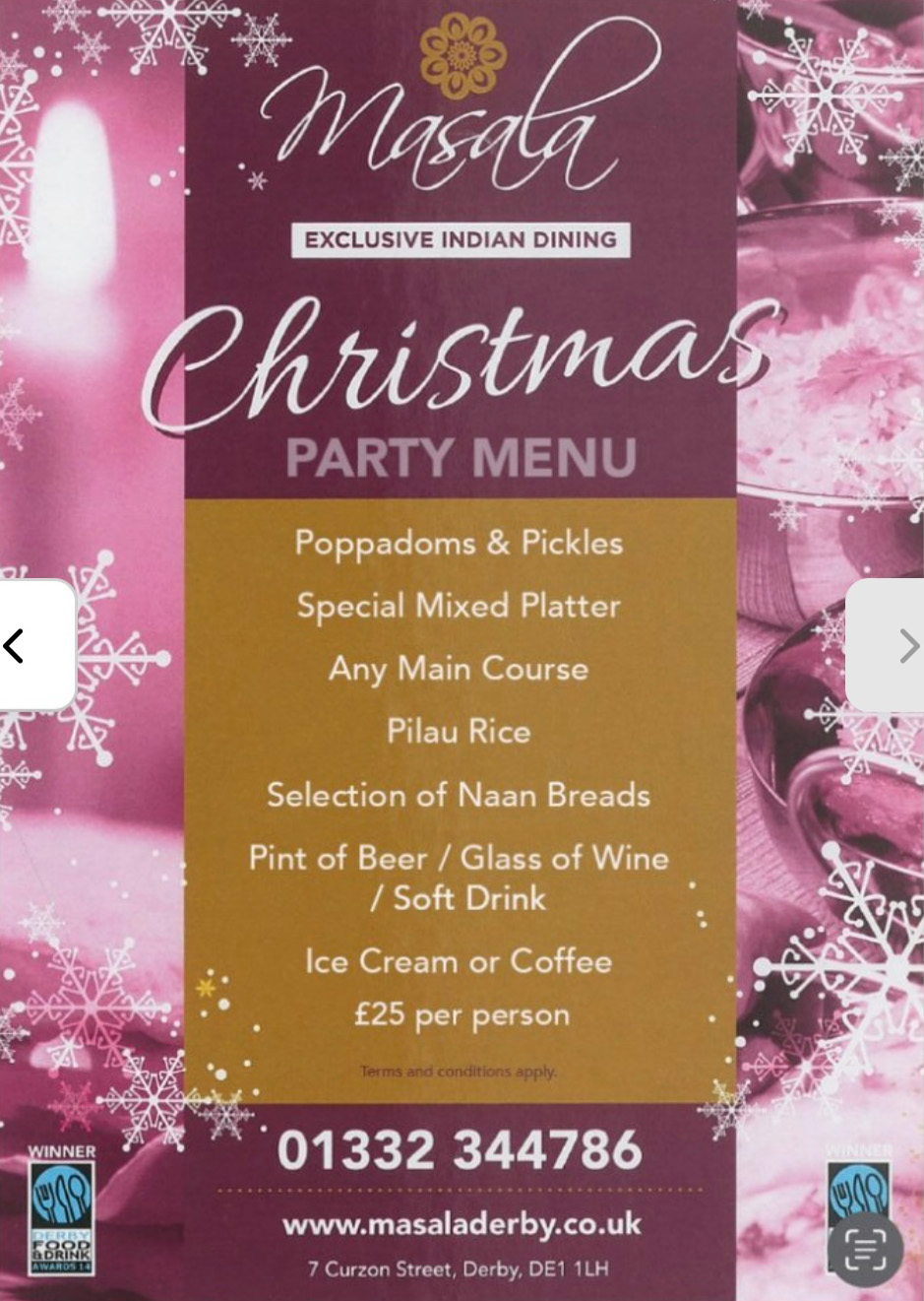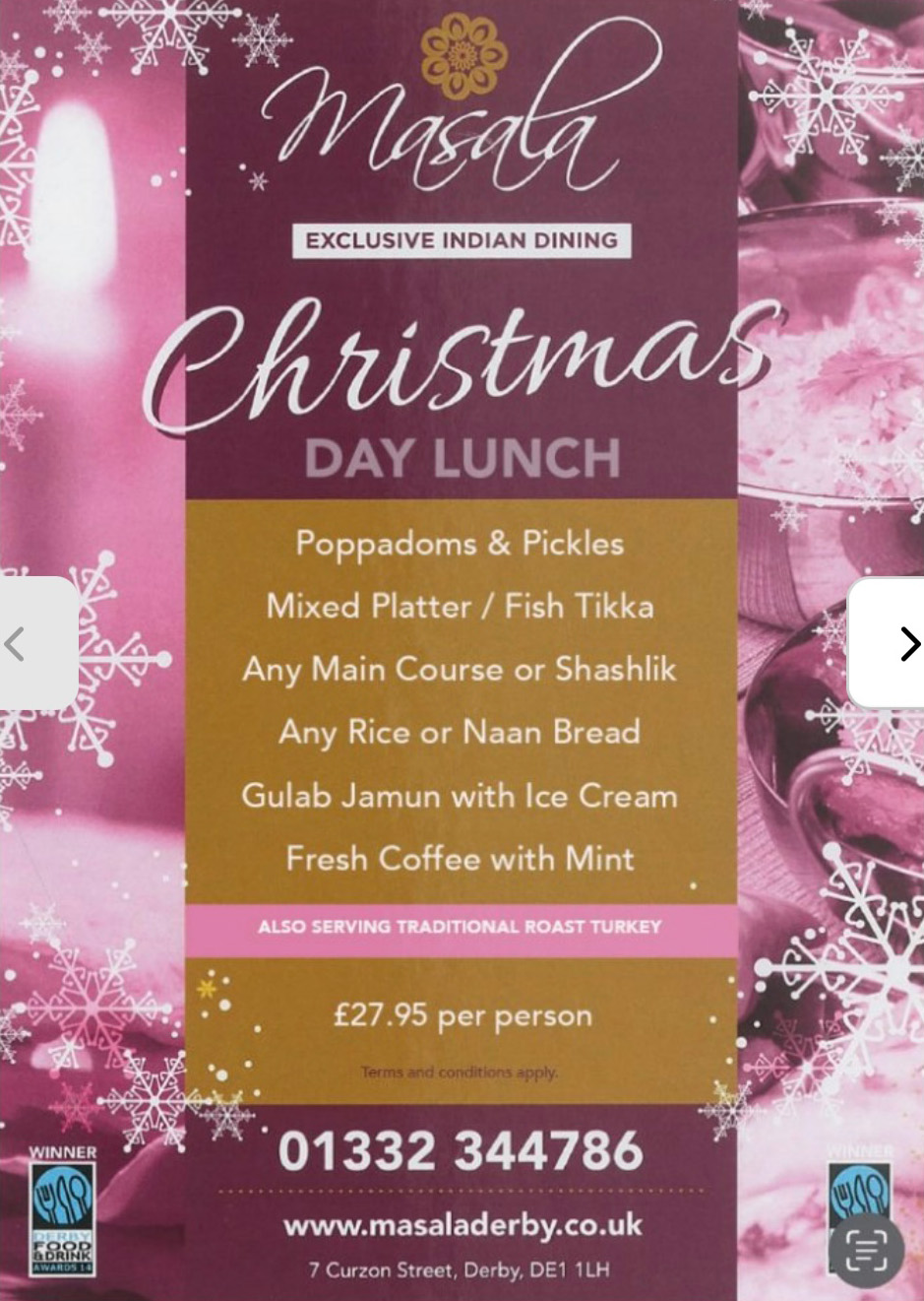 "As a couple that used to live in derby whenever we return we seem to be drawn to masala, the sultani is by far my favourite curry and will come all the way to derby to get it. The service was excellent as usual and will definitely be coming here again!"